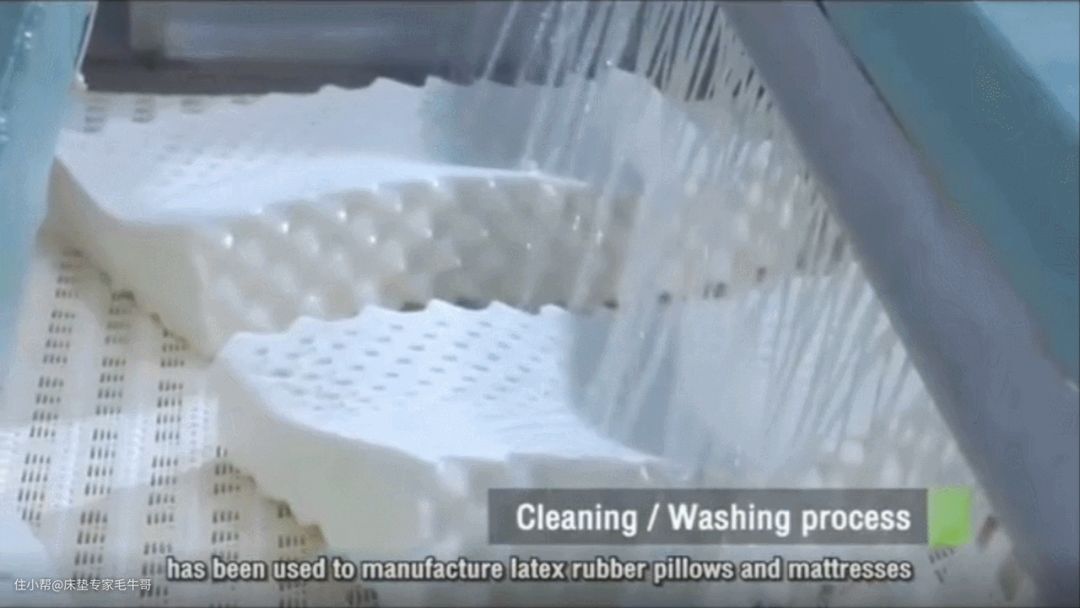 乳胶床垫或乳胶枕成型做好后,还需要清洁下了为了保持天然乳胶原液的液体状态,需要添加氨水,就会在这一步被处理掉。刚做出的乳胶床垫是超级软绵的,需要用冷水冲洗2次以避免其中带着杂质(有些工厂不一定会有这一个步骤),这样做也会有更好的定型效果,还能除氨。