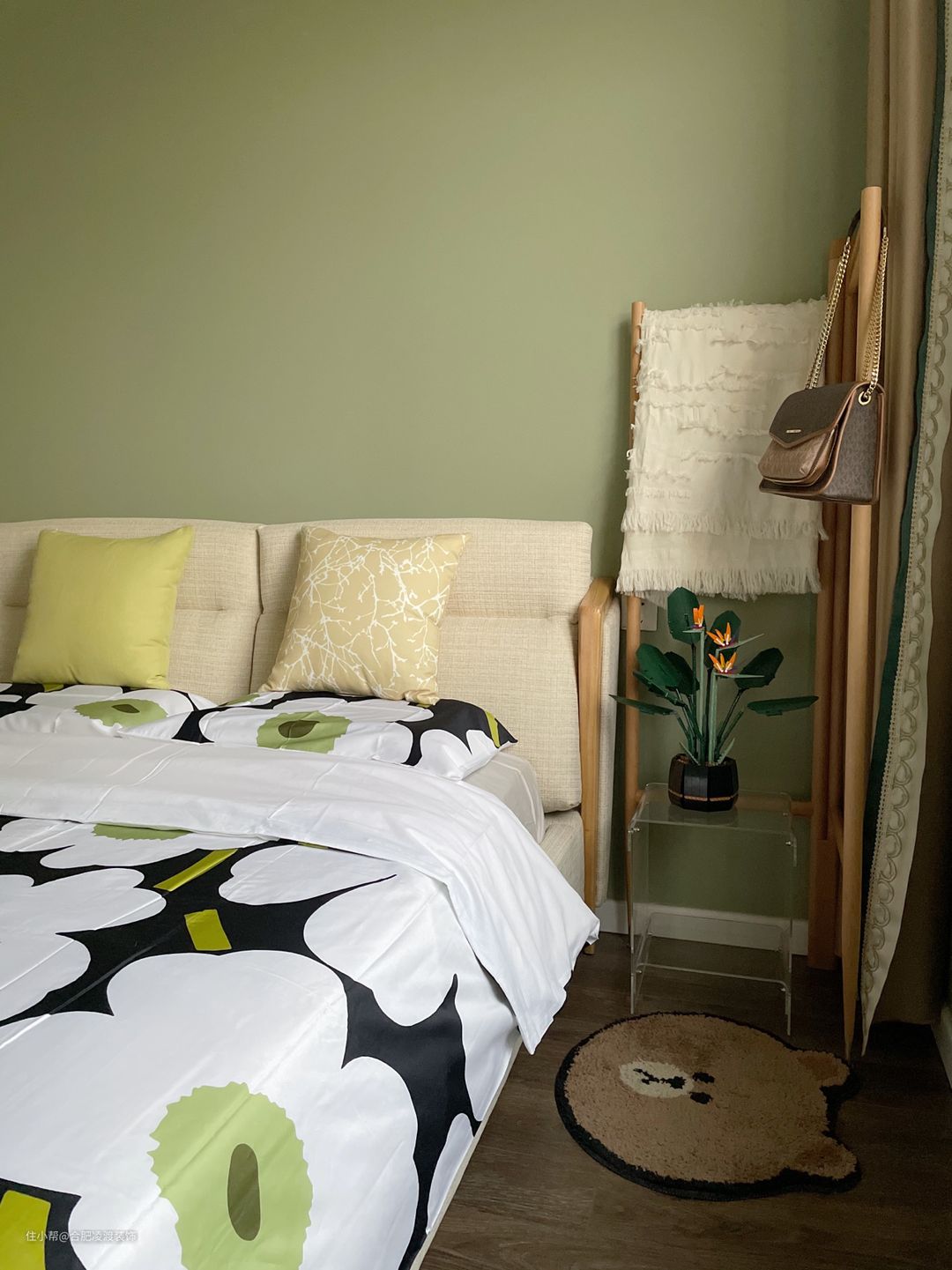 牛油果绿+金色五金,整个空间的饱和度虽然很高,但不是那种鲜艳的绿色,四面墙都是治愈系绿,和衣柜的绿有种和谐美,特别是傍晚阳光照进来的时候,显得整个空间十分的温馨。