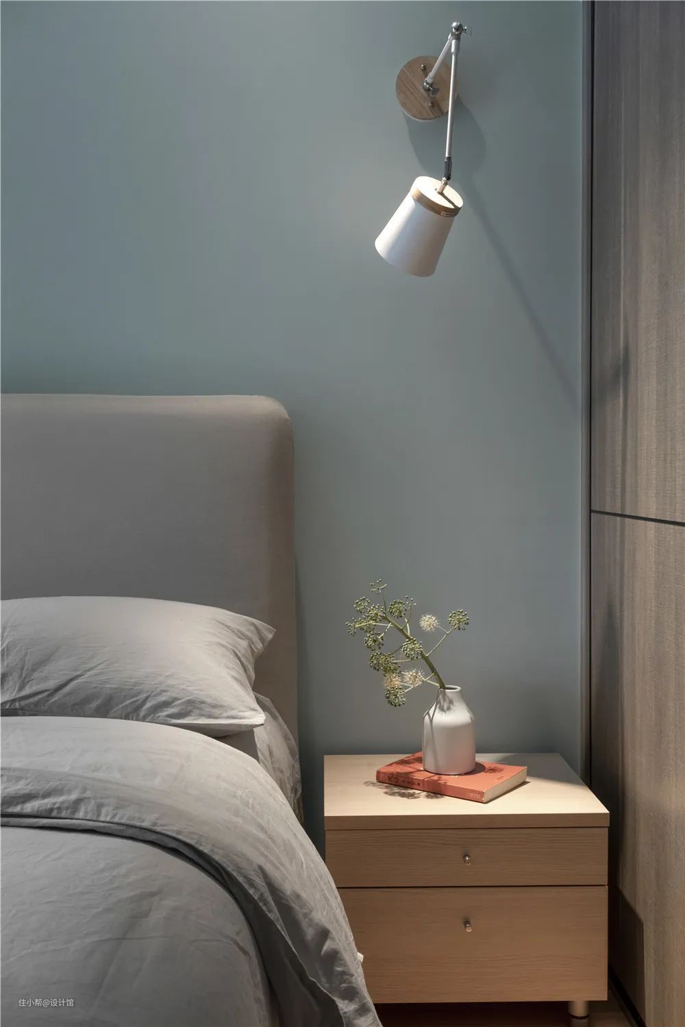 ▲主卧室的设计仍然保持着素雅的灰色调,床采用灰色调,搭配着木色的床头柜,整个房间显得非常舒适宜人。灰色的墙壁和地板让房间更加明亮宽敞,同时也在视觉上增强了房间的高度。