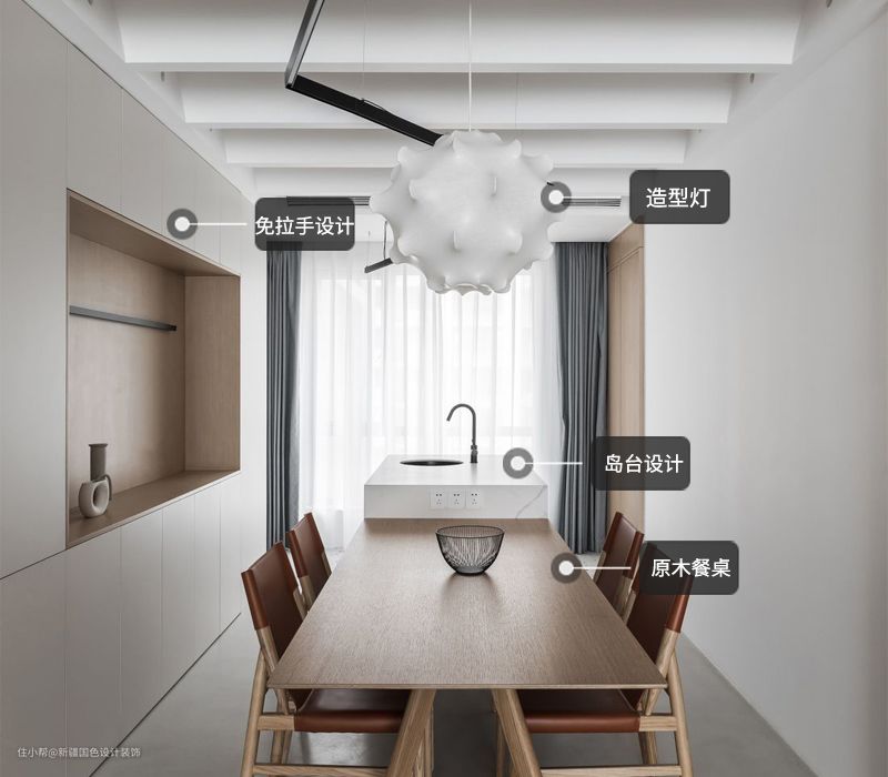本套案例整体走现代简约风格,全屋定制大量柜体,整体采用白色以及原木色,色调统一,收纳空间充足。地砖通铺,视觉上显大通透。餐厅做了岛台设计,搭配原木色餐桌,简单耐看。整体浅色系,百搭耐看不过时。