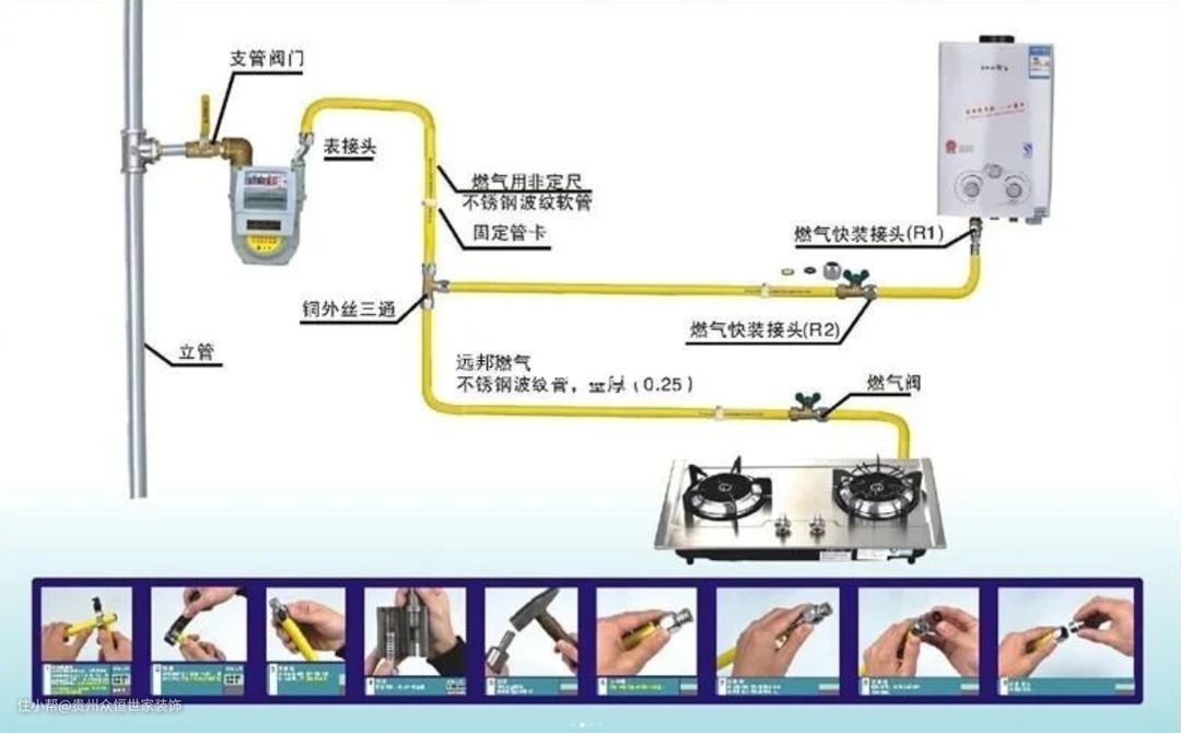 ⑧燃气管道与燃气具的距离超过2米的,需使用燃气专用不锈钢波纹管或镀锌管进行连接。