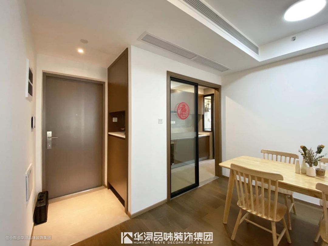 厨房和餐厅位置应女业主的需求,利用黑色的铝合金材料和钢化玻璃做了隔断,把厨餐厅分可开放,烹饪时可隔绝油烟,保护家人,平时可打开通风透光。