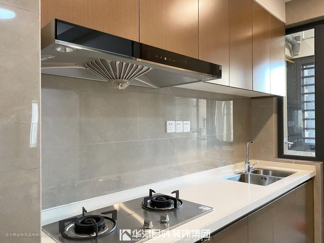 安装了嵌入式的抽油烟机,油烟机上方充分利用空间设计了通顶的储物柜,让业主储藏食材拿取便利,且极容易清洁,油烟机下方墙壁贴大理石,不仅不易渗透墙面,还有效保护墙体方便清理油烟,是厨房的点睛之笔。