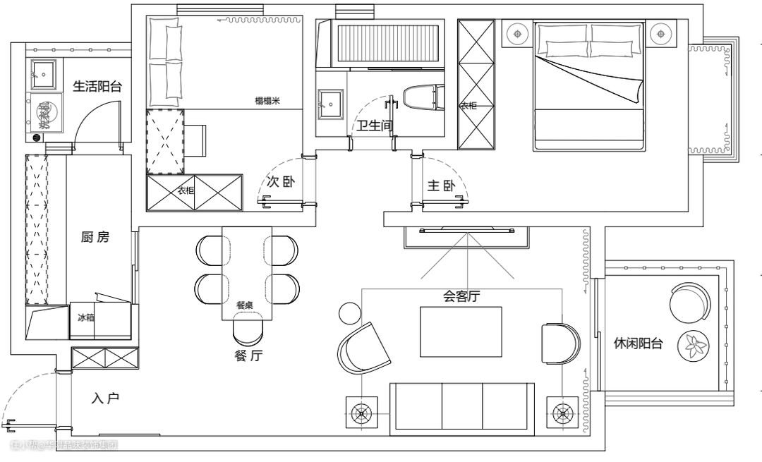 此户型为两房两厅一厨一卫并带有生活阳台和休闲阳台的结构,从入户玄关进来映入眼帘的是客餐厅,客厅可以通往休闲阳台。厨房位于入户玄关的左侧,生活阳台需要从厨房经过,客餐厅中间位置的过道两侧分别是主卧和次卧,卫生间位于主次卧中间。
