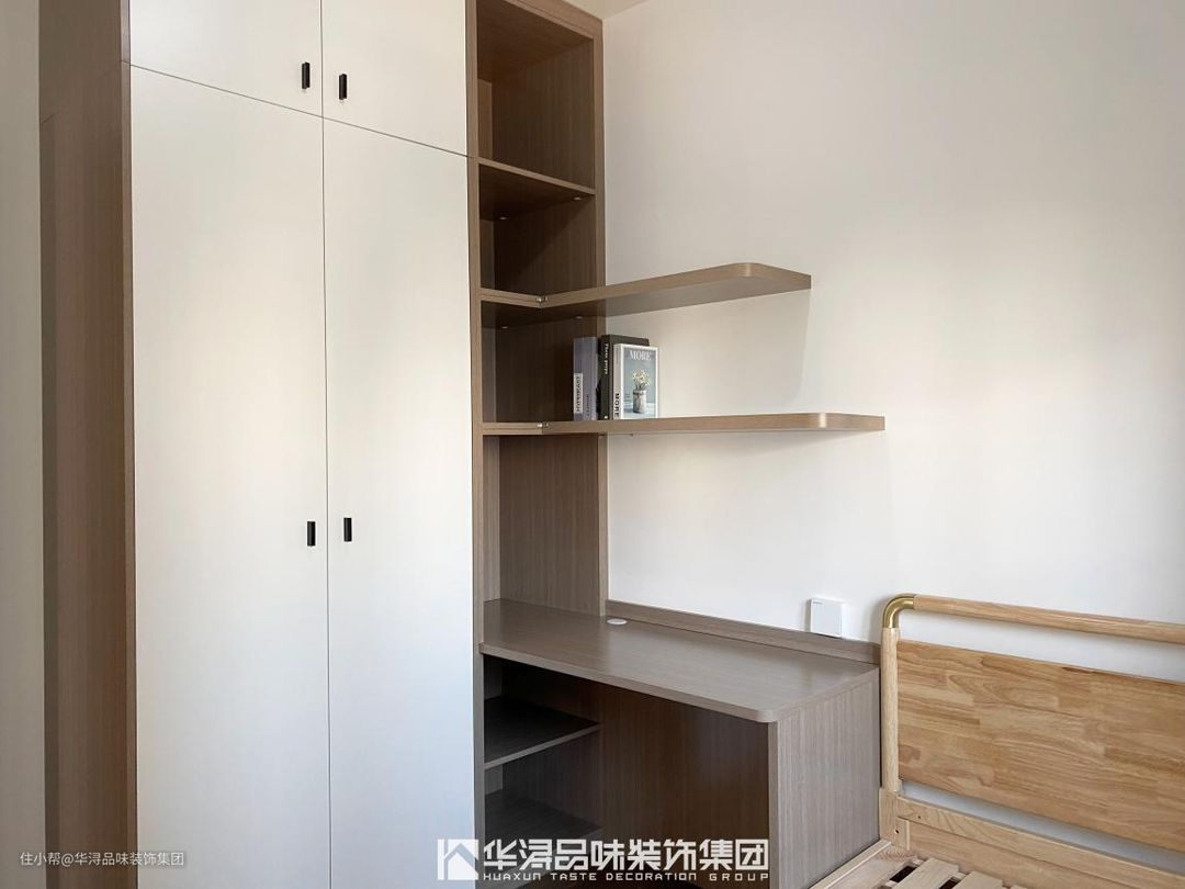 房间定制了通顶的衣柜,下半部分可以满足日常换洗衣物的存放,上方位来换季衣物和被褥的收纳和保管。靠床头位置做了特殊处理,设计成书桌的形式,既可以当床头柜来使用,又可以当梳妆桌使用,上方还设计了类似书架的布局,可以用来摆放日常书籍,孔家运用整体更加紧凑且美观实用。选用了木质元素的大床,不仅和地板元素相呼应,而且环保简洁。