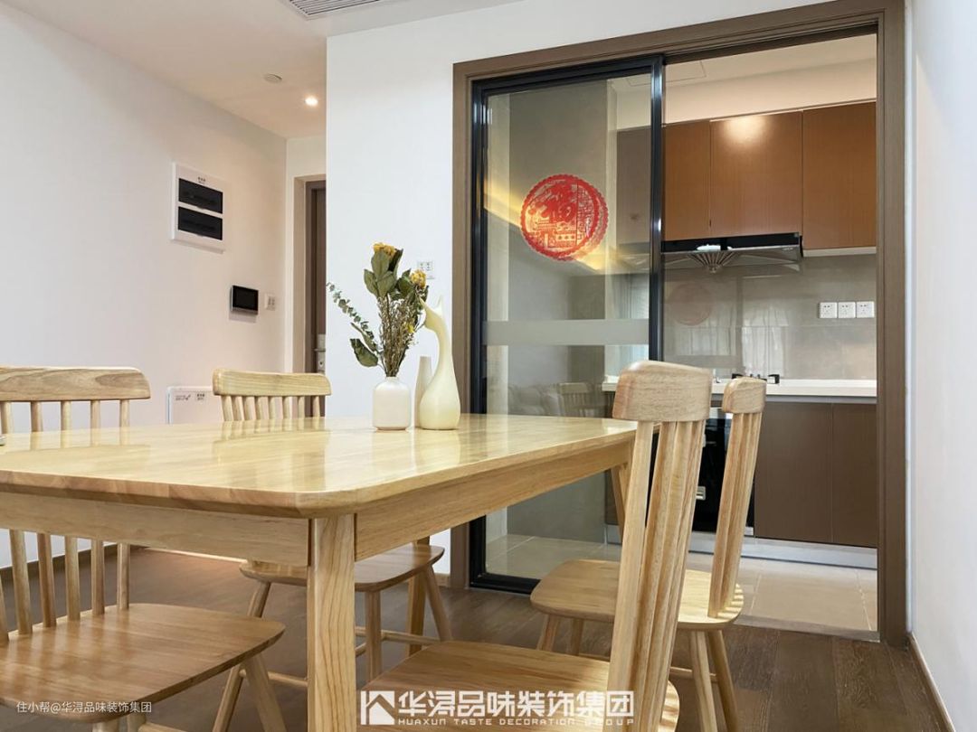 餐厅位置延用了吸顶灯的照明方式,摆放了四人位的长方桌满足业主家庭成员的日常就餐需求。餐桌上方放置的干花,在进来第一眼就能看到,可以给人一种温馨感,褪去一天的疲惫,让人从工作的忙碌和生活的压力中轻松下来。