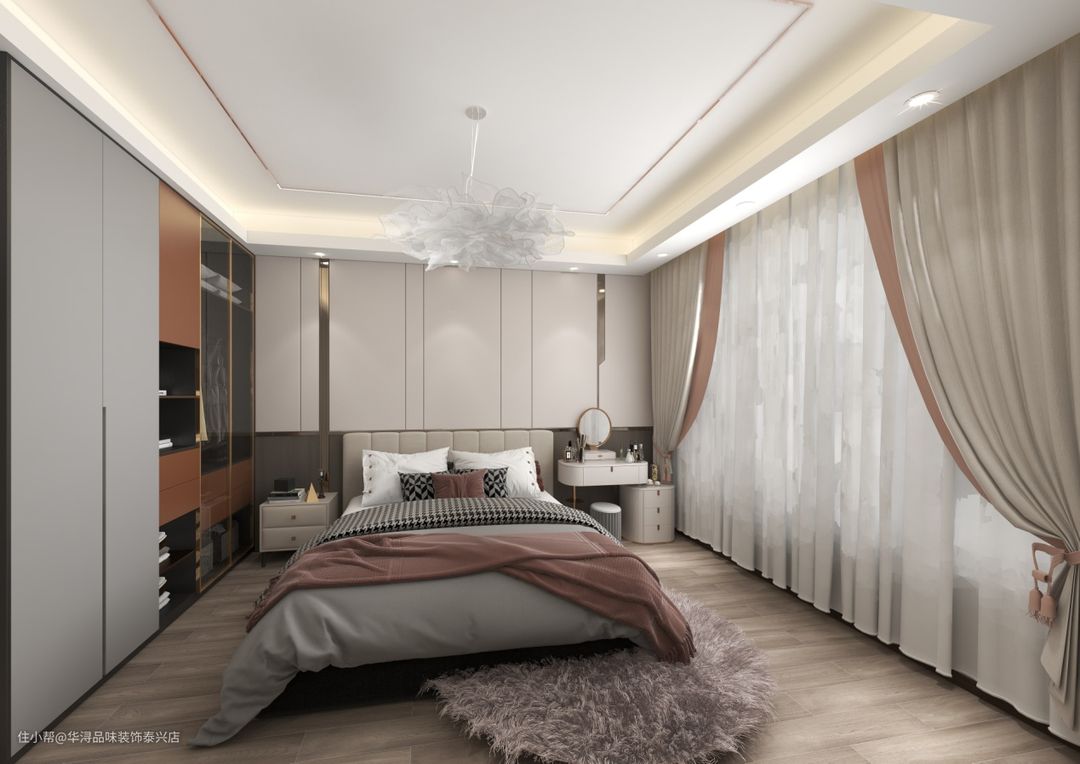 棕咖色系品味,深棕色毛毯、米黄掩映的双层窗帘、浅咖色毛绒地毯以及浅色系原木地板格色调互为呼应统一,给人以视觉上的和谐美。