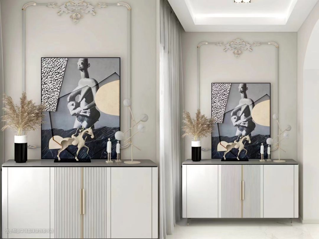 一入户迎面而来的便是满满的精致感,精雕细刻的镂空金属框架、丛丛开放的苇花、抽象感十足的后现代主义画像策马奔腾的立体摆件,几者的搭配极尽现代美学元素。