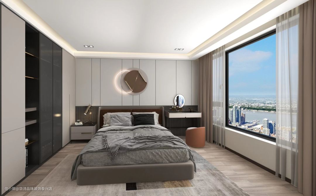 靠近墙面是一面一体式顶柜,两侧做了一实一虚的设计,一面是弥补透光的高级灰,用于储藏重大物件,一面采用透光玻璃,美观大方。