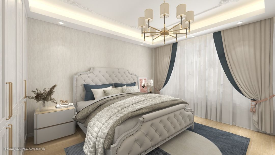 精致雕花的石膏吊顶,明净圣洁,与周围纯色墙壁互为掩映,加之温柔梦幻的羽毛吊灯和精雕细琢的太阳花挂件,使人仿佛置身仙境,朦胧又缠绵。