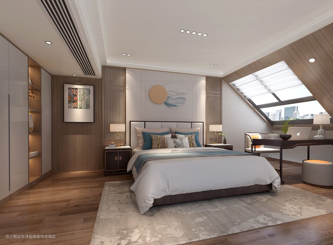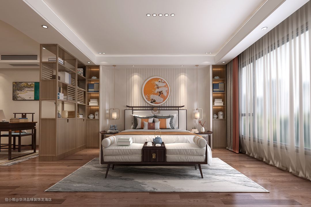 主卧在收敛的引入中国风的元素,于文化氤氲处,涵容古朴风雅之致。在卧室设有博古架担当空间的软隔断,巧妙地将卧室与阅读区一分为二,一同营造舒适惬意的空间情绪。