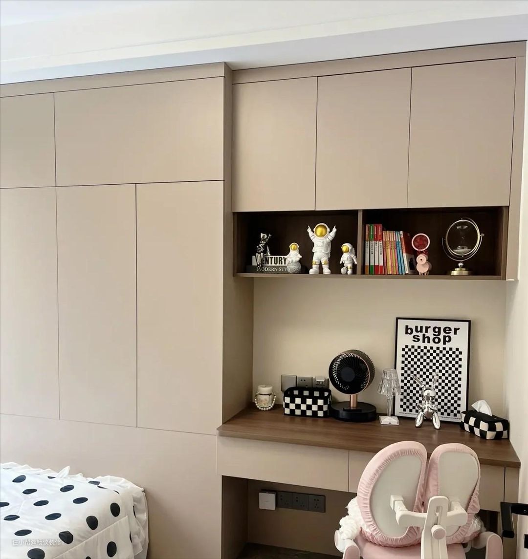 也因这个原因,当初在柜门设计上,拒门玻璃门,选择木质柜门,通过隐藏式拉手的设计做出造型,让美观性得到了保证,实用处自然就不用说了。