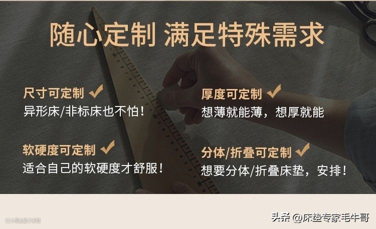很多小伙伴一听定制就觉得会很贵,实则不然!定制并不高大上,对于床垫而言反而是刚需。因为不同的人睡眠习惯各不相同,国产平价床垫也能提供定制服务,告知商家你的身高体重和睡感偏好,专业能做定制的商家就会为你制作出最符合你需求的自家产品,这其实就是定制,和床垫价格无关,和商家的服务有关。