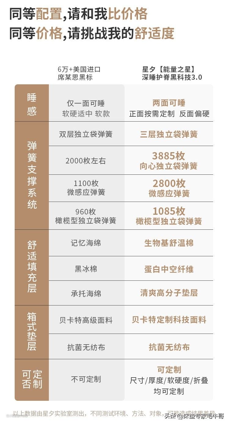 上面这张图则是一款国产1万出头的高端床垫与席梦思6万多的甜梦黑标系列奢华床垫的配置对比表,也可以很明显地对比出来进口和国产床垫配置的高低。国产款高端床垫不仅可以正反双面睡,还将核心的弹簧层升级到了3层!睡感上十分的柔软舒适,包裹感更足,睡感上更符合国人对高端床垫的软中带硬的喜好,并且价格仅需进口的1/6!
