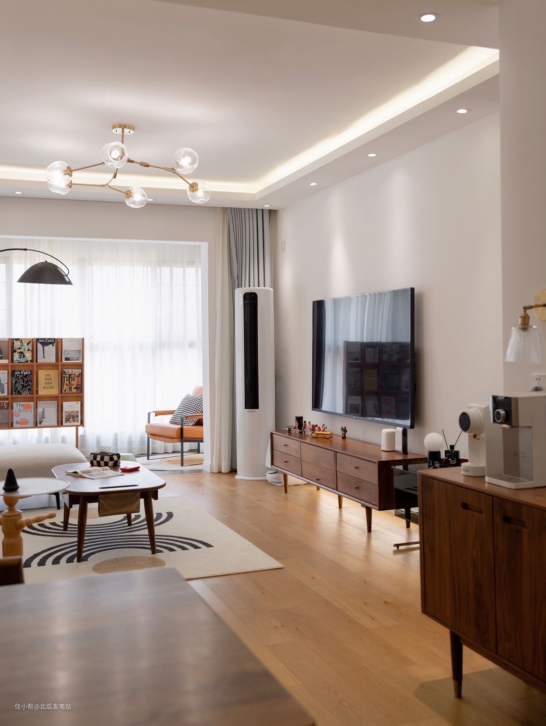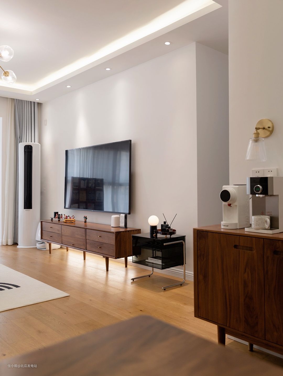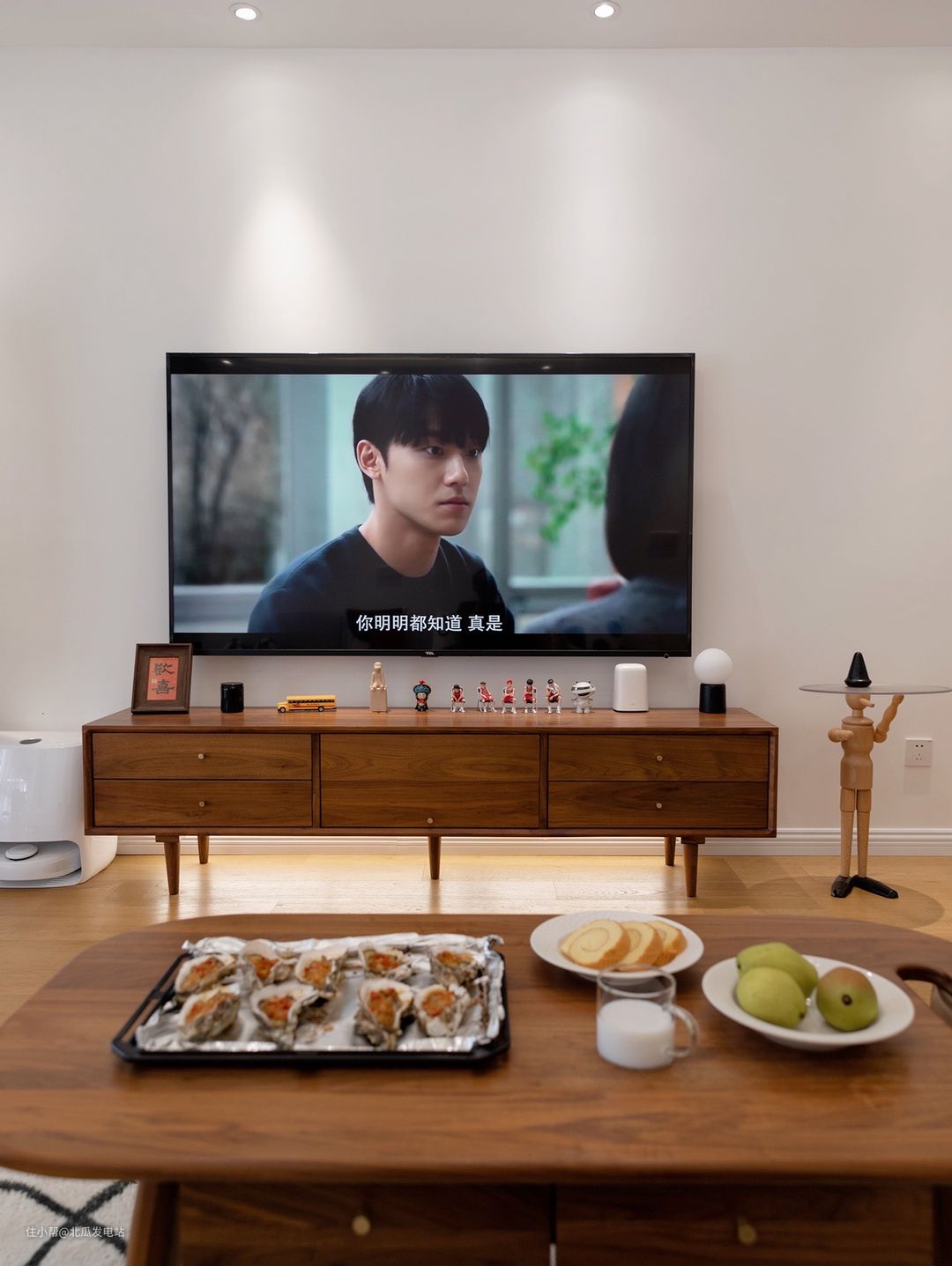 全屋大白墙,没有做沙发背景墙和电视背景墙,简简单单不容易出错,借助了射灯洗墙,开灯后会有一种奶油色调,色温是4000k。