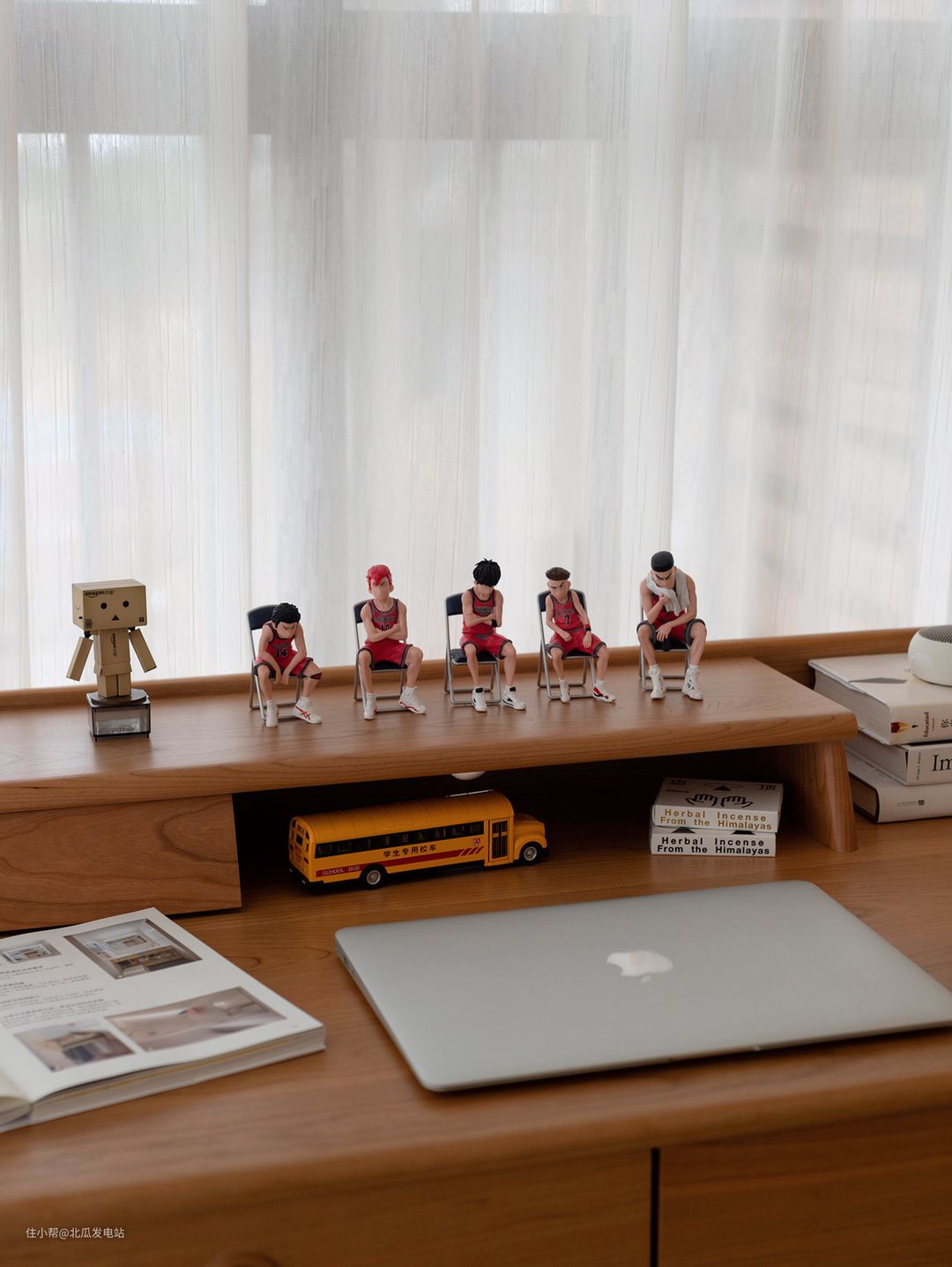 其他一些辅助家具是樱桃木的,大致的比例是60%黑胡桃木+20%樱桃木+10%黑色+10%白色,图片里应该比较明显看出几个木种的颜色对比,下面这个杂志架、桌子和木偶人就是樱桃木的。