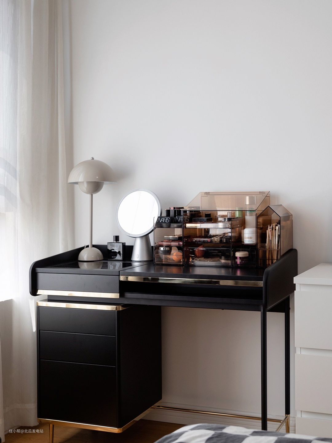 床尾布置了一个六抽屉的斗柜+梳妆台的床尾组合,可以很好的收纳卧室里七零八落的东西,让卧室容易保持整洁。