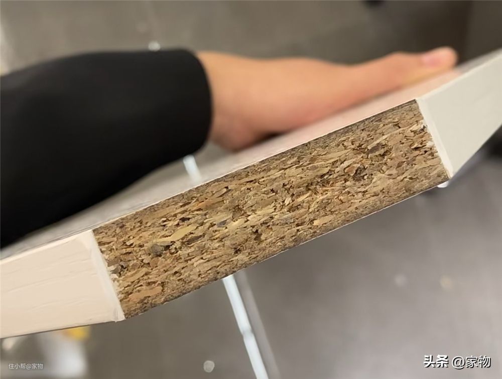 颗粒板其实算得上是刨花板的一种,它看上去就是一种用木渣压出的板子,我个人感觉它最大的优点是握钉力强,钉子打进去不容易松动,稳定性也算不错。