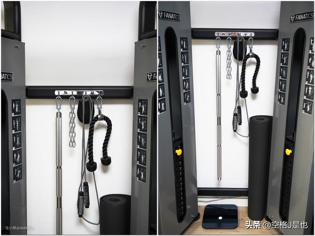 赠送的有双头绳、三角握把绳(加长面拉绳)、后踢辅助带、直柄长把手、延长链这些,都是非常有用的配件,等下介绍动作时会说。这里本身其实就是个置物区,所以我也把自己的瑜伽垫、体脂秤和跳绳也都挪这里了,回头再买个小推车放体脂秤上面,再把手套筋膜枪什么的都拿过来,充分利用下空间。