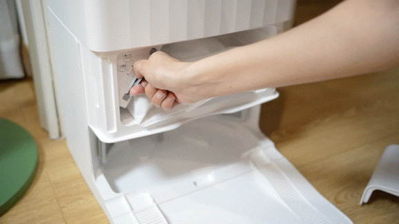 P10的这个基站内置的2.7L大容量集尘袋,可以做到65天一抛弃,尘袋抽出后自动封口,不会存在二次污染的情况。