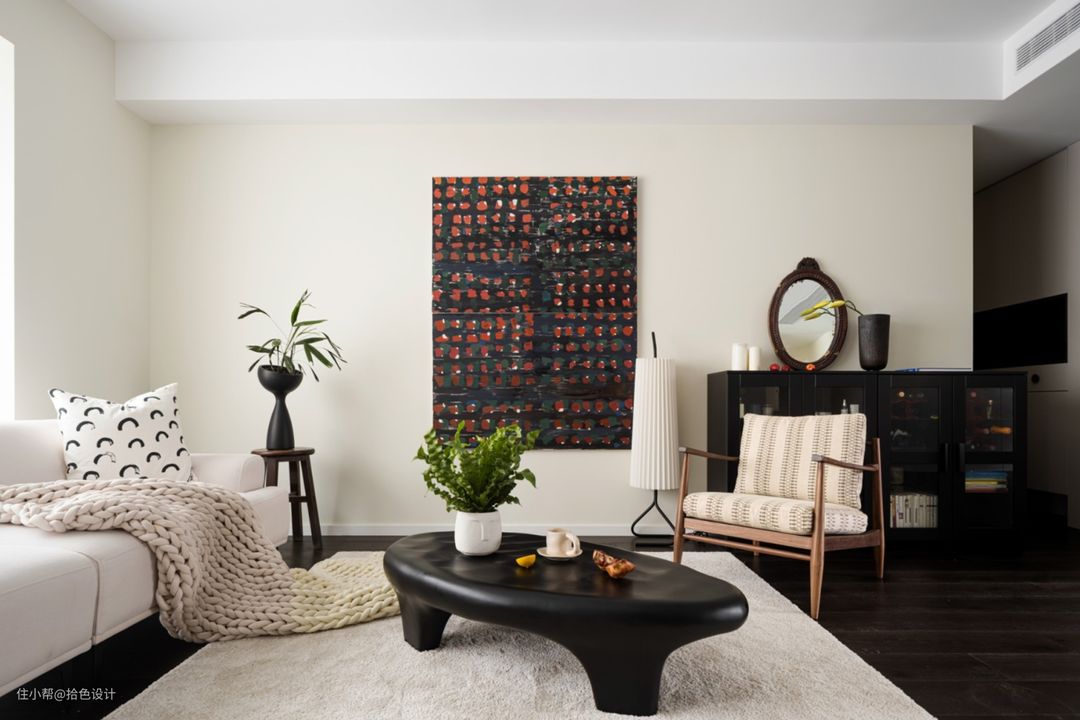 考虑到屋主有绘画的爱好,沙发墙直接做留白处理,并通过自制装饰画、绿植、以及中古家具点缀,既体现了自然、温和的生活状态,又有了一丝古朴的韵味,且不失生机感。