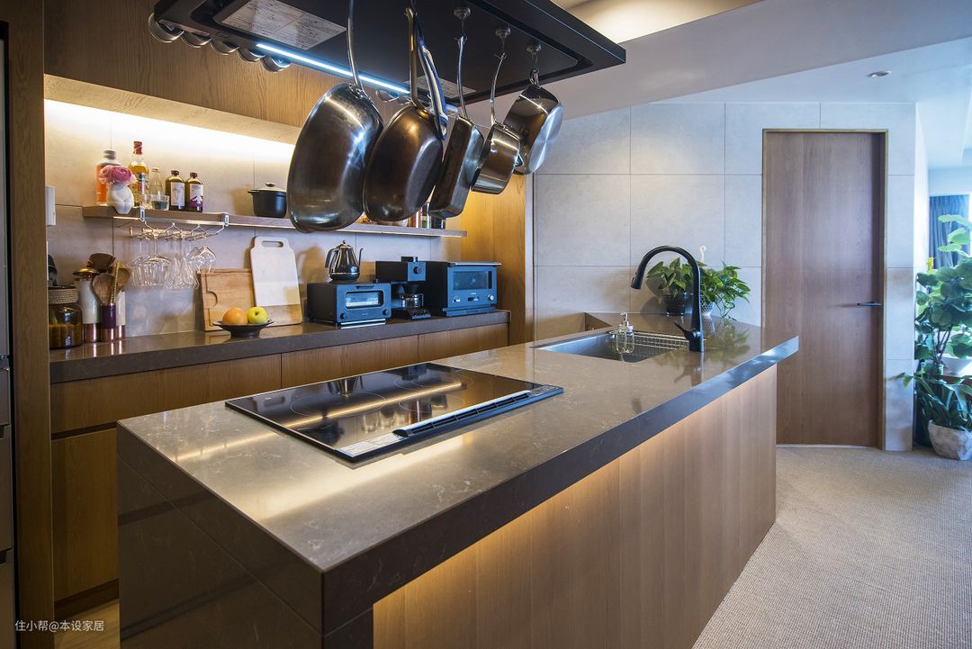 II型的厨房,也是使用柚木橱柜,灶台和洗菜盆靠近餐厅,烹饪时视野比较好,亲朋好友来访,也方便沟通。