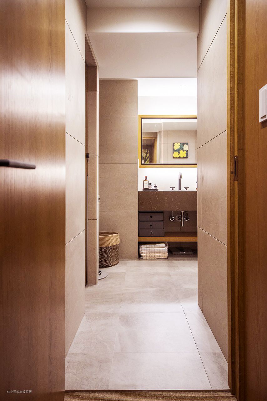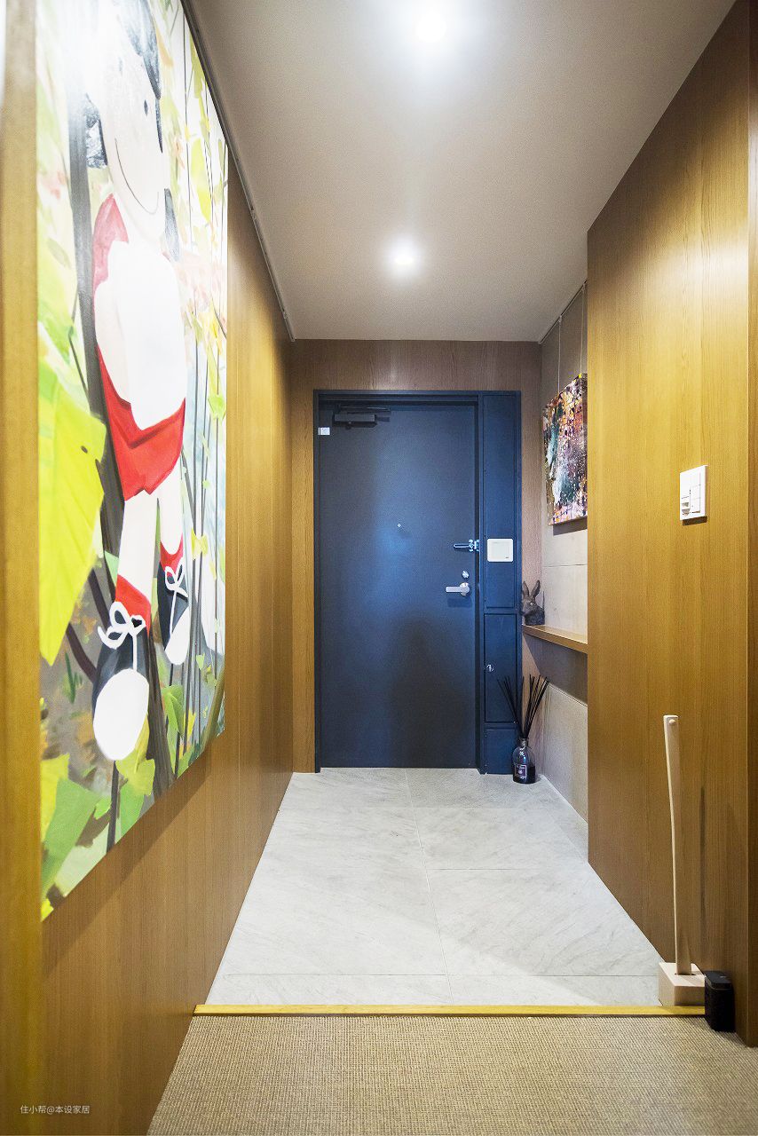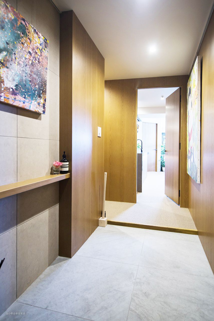 地面铺设仿大理石灰色砖,墙面大面积使用柚木色饰面,回家就被温馨的氛围包围,为了保持通道尺寸,这里没有做鞋柜,只是在墙面1米处安装一道木层板,放置钥匙、免洗酒精等用品,墙面的两幅抽象装饰画,瞬间提升了艺术氛围,让空间更显品质感。