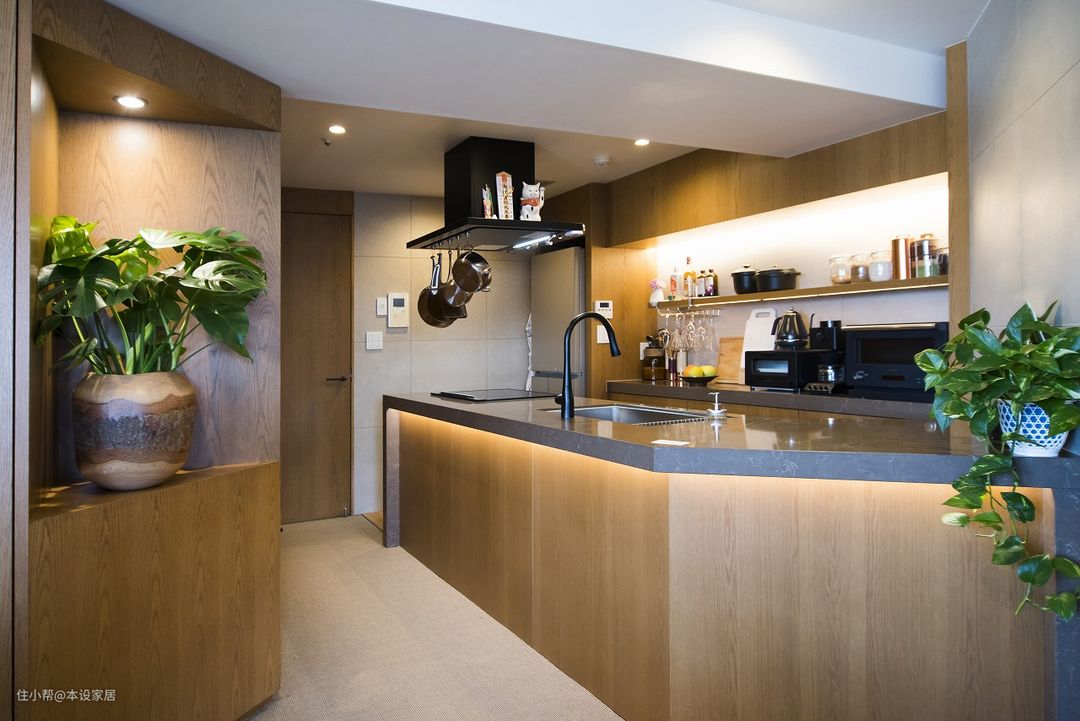 另一侧的收纳台则选用储物柜+开放式层架,底部和上部都暗藏LED灯带,说明灯光的布置非常重要,暖暖的灯光能取悦自己的心情,即便是一个人住,也可以拥有最幸福的时光。
