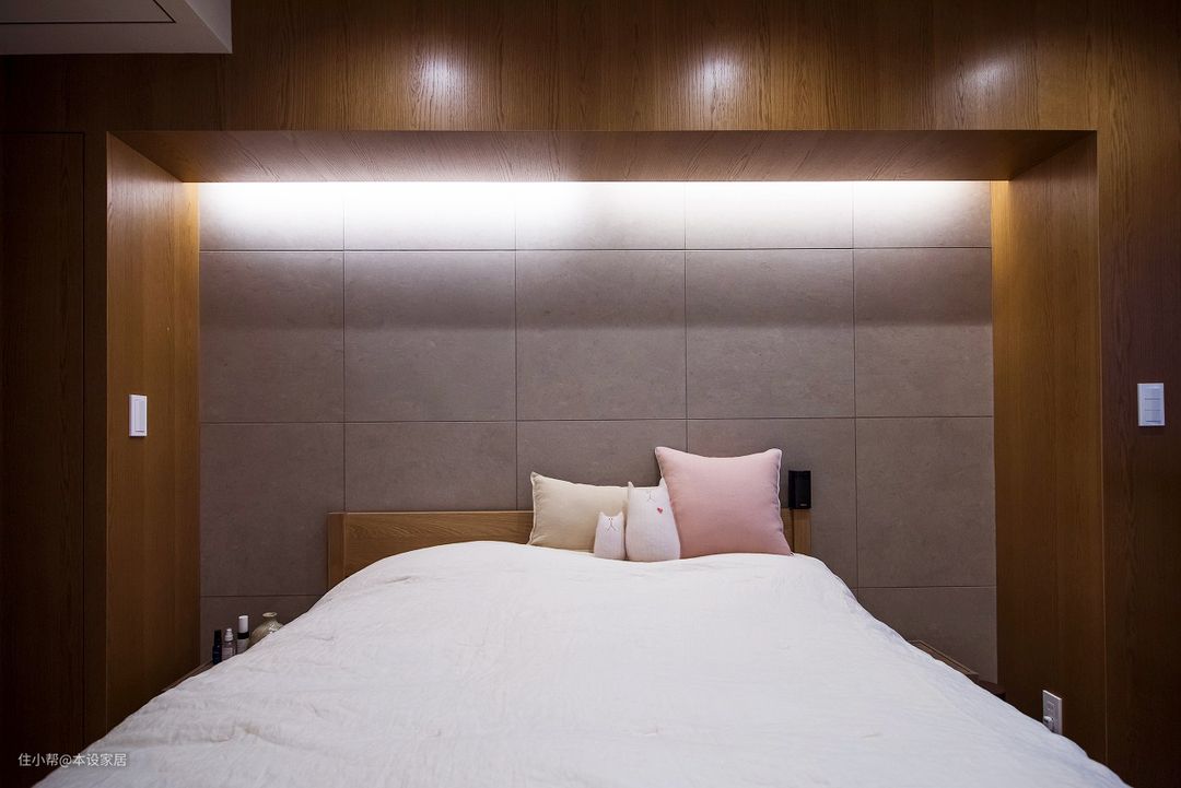 卧室的面积比较大,约12㎡,还附带衣帽间,小姐姐选择了一张宽度1.8米的大床,让整个空间变得十分协调,暖暖的灯光烘托出温馨的氛围,从进门的那一刻便扑面而来。