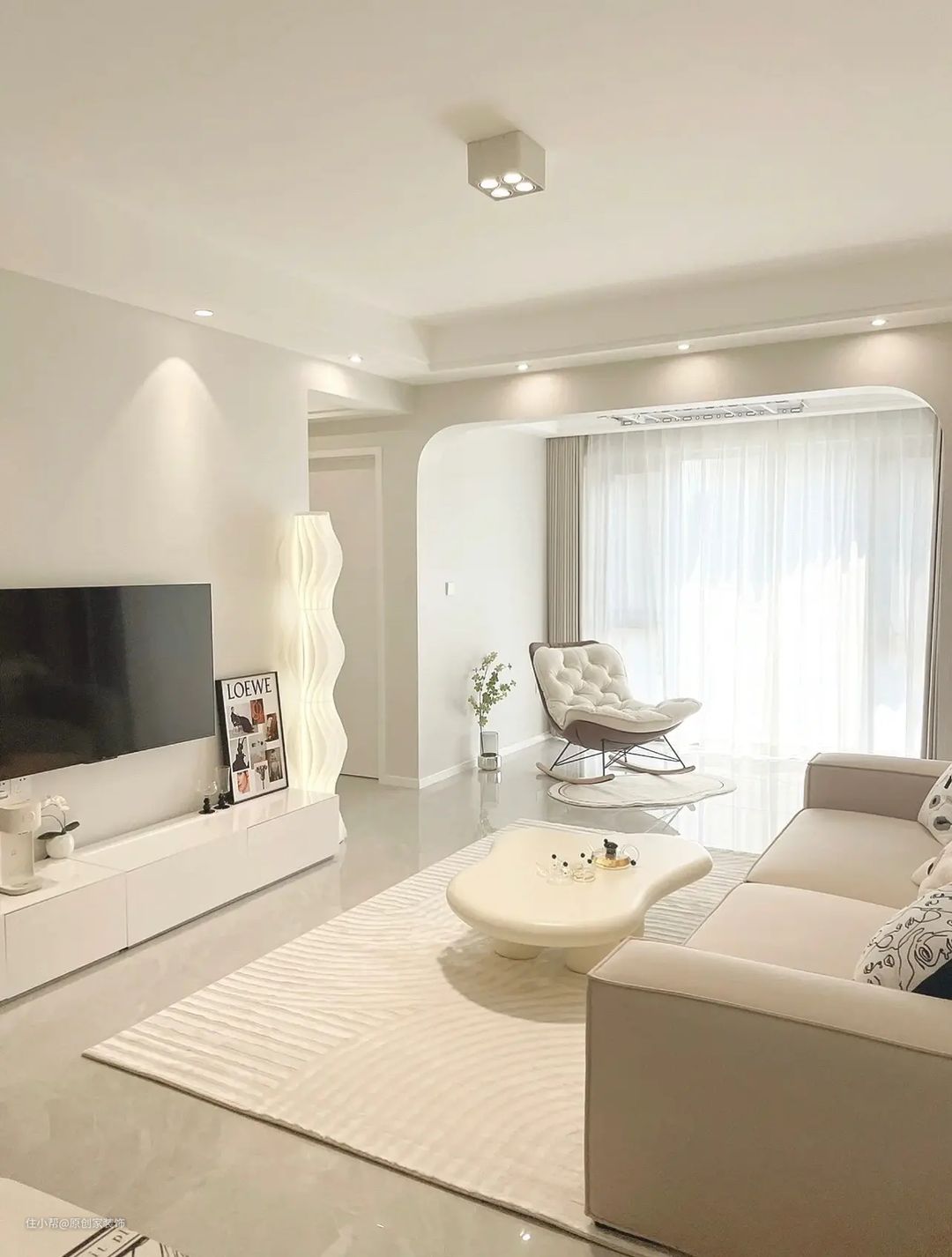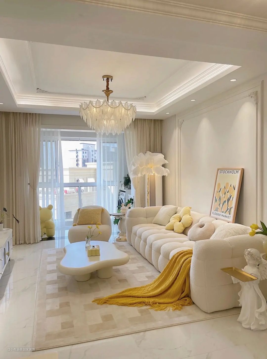 浅灰色的墙壁用白色石膏线勾勒出矩形轮廓,奶白色的沙发上,用玫瑰粉色的抱枕点缀,白色镶金色边的组合茶几和香槟色的布帘则透露出几分轻奢感。
