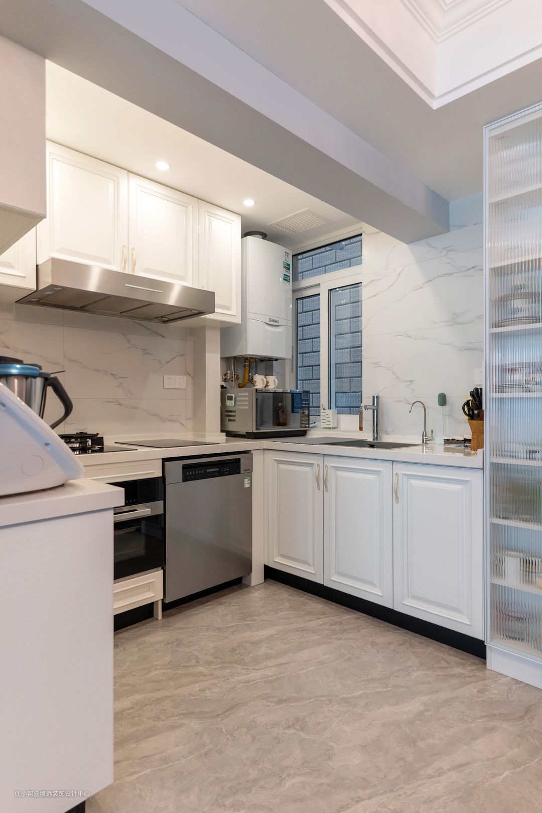 厨房改造后,操作面积更大,冰箱连接餐边柜到U型橱柜,形成一处整体功能区,拿、洗、切、炒,动线合理。