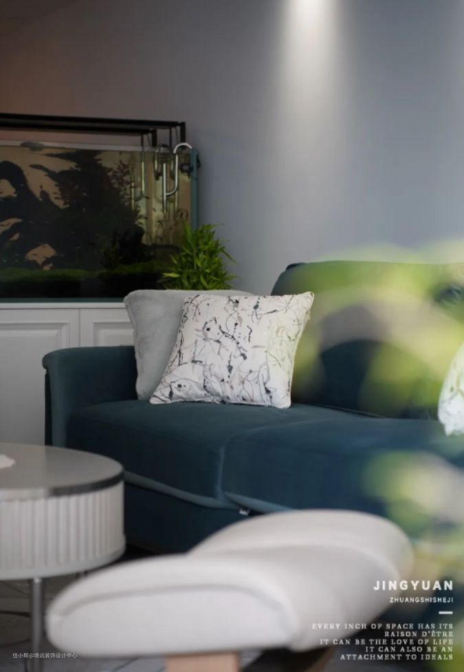 男业主喜爱的大鱼缸,绿色幻彩,放置在进门隔断处,既是客厅布景的一部分,又承担了进门视线的阻挡作用,不至于让客厅内部暴露在入户视角下,提高了隐私性。