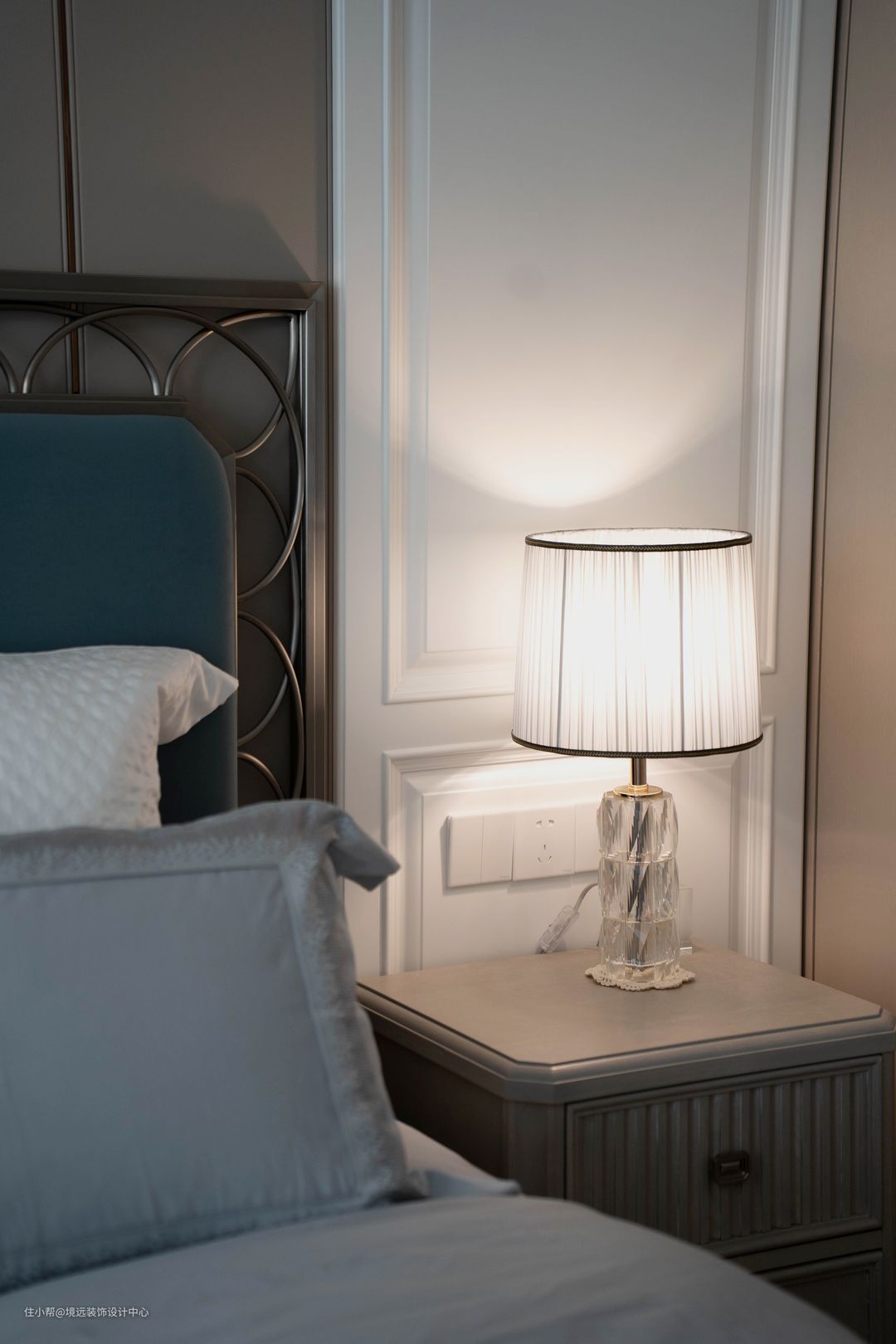 现代感轻美式的重点就是家具的选择,不过分繁乱的元素堆砌,而是精挑细选的小细节。床头水晶台灯,布面褶皱灯罩,金属元素搭配,沉稳内敛的高级感烘托出睡眠区的舒适氛围。