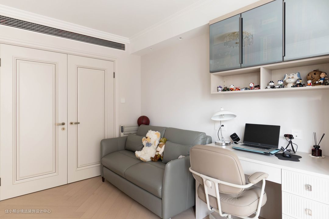 地面和主卧一样,采用人字形铺贴,温暖有质感。书桌沿用全屋定制的美式家具,风格统一整体。