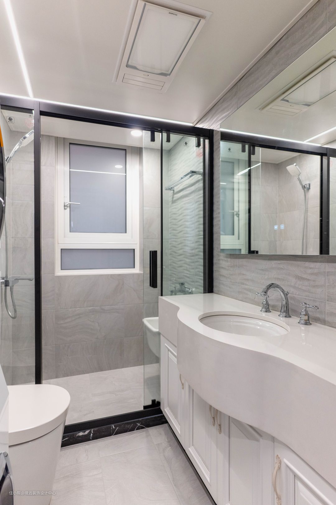 浴室主要以现代简约白色系为主,满足日常使用即可,展现干净整洁的洗浴氛围。超大台盆,台面空间宽阔,台下陶瓷盆好清洁,搭配美式风格旋钮水龙头,小细节处也表达了精致的生活态度。