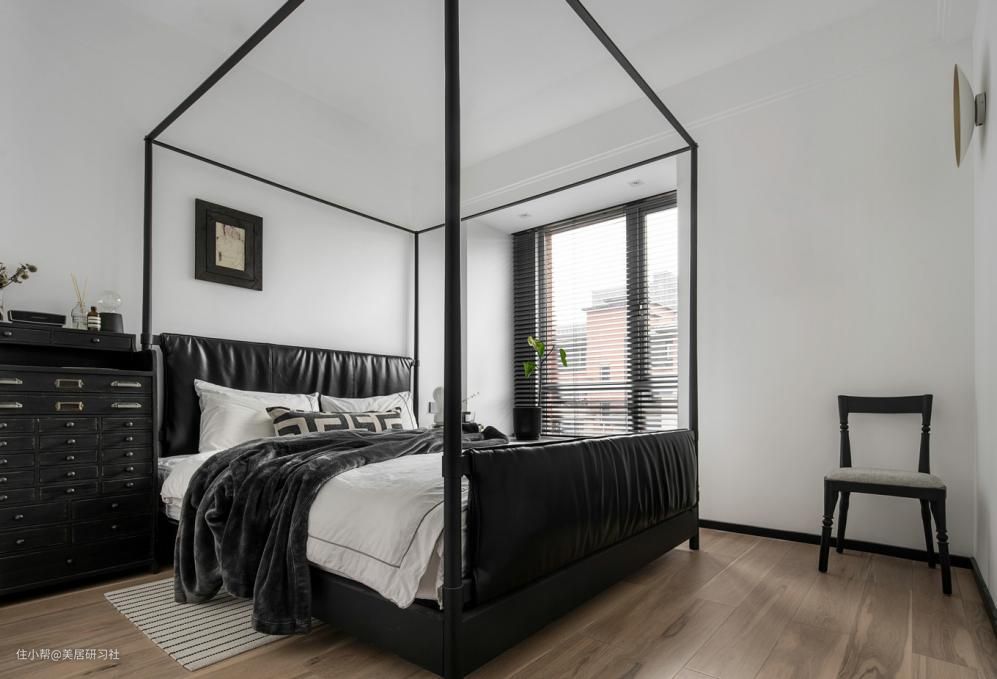 主卧室延续了客厅的木地板加大白墙设计,而黑色的皮质格子床,融合了中式和轻奢的格调,而左侧的床头柜同样换成了黑色的五斗柜款式,右侧则是金属材质床头柜,对比很强烈,十分特别!
