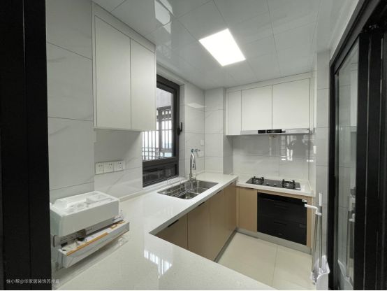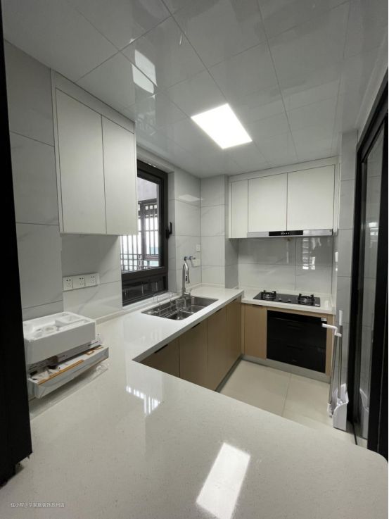 - 厨房吊顶选择亮面扣板,预留LED灯的位置,使顶面更加整齐统一。亮面扣板防水防潮还方便后期维修,白色百搭,使厨房更加通透。