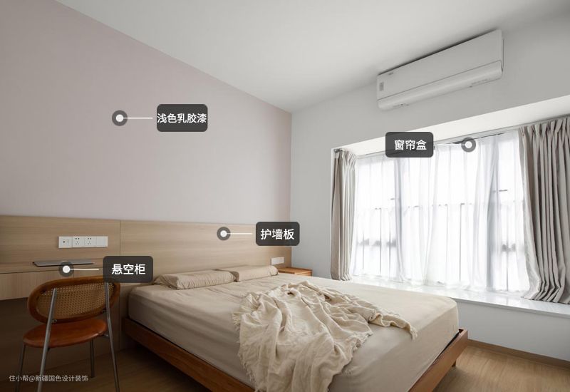 主卧背景墙刷了浅粉色的乳胶漆,床头部分摒弃了传统的床头靠背做了半墙护墙板,旁边做悬空床头柜,整体简洁,满足日常使用需求。