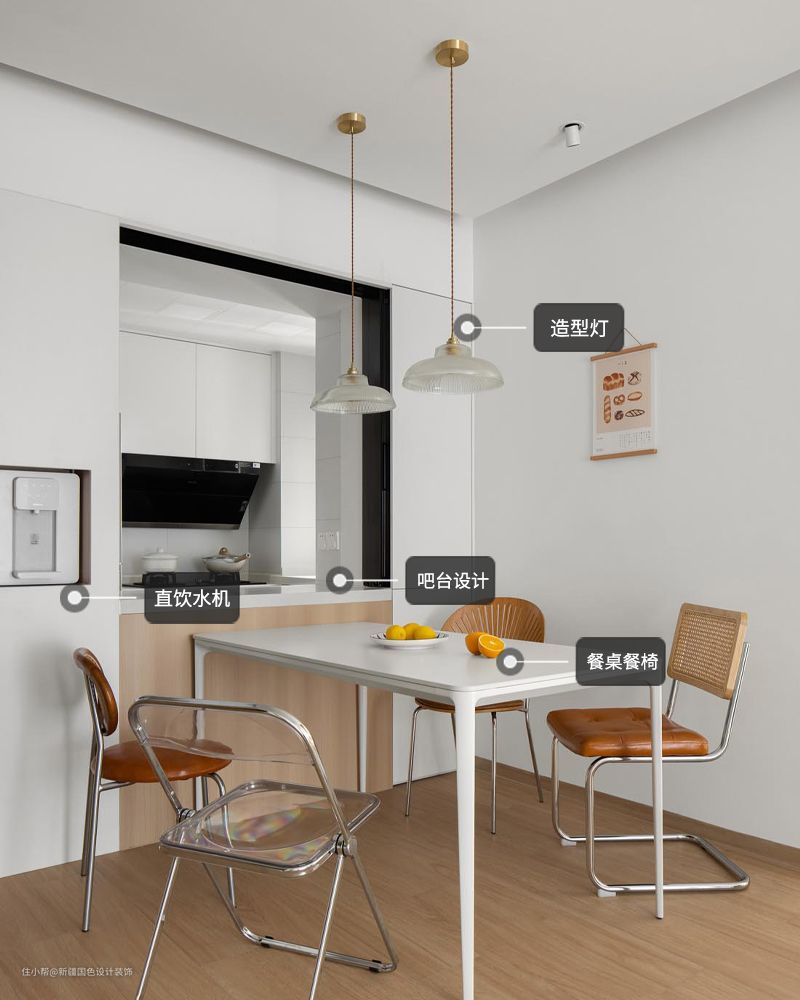 餐厅整体区域采光明朗,简单的餐桌餐椅搭配顶上的吊灯,整体用餐氛围感十足。