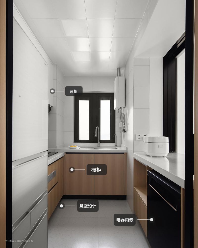 厨房整体采用原木+白色系,看着整洁舒适,橱柜底部悬空设计,无卫生死角方便打扫,整体白色系让整个厨房看起来通透明亮。