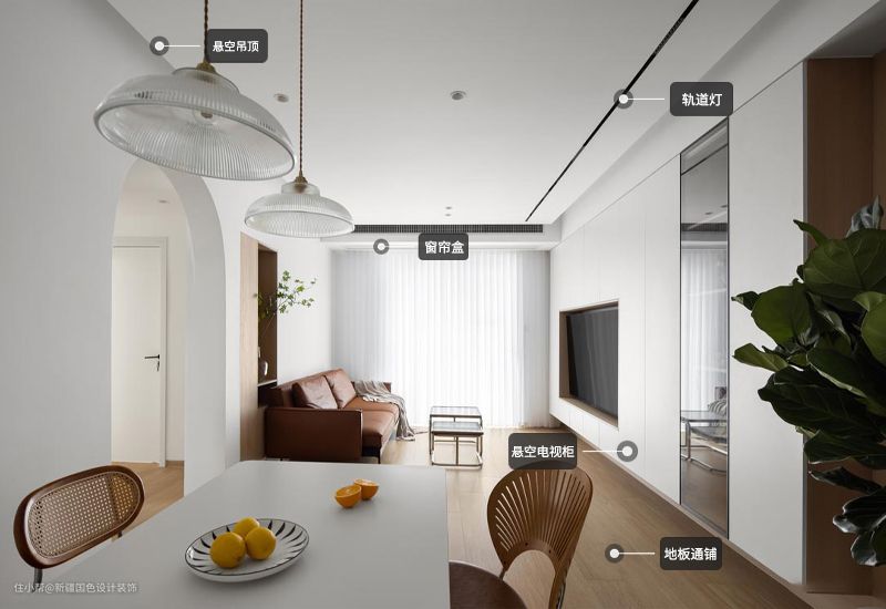 客厅做了无主灯设计,悬浮顶+轨道灯的组合,外加小筒灯,合理分配光源。电视背景墙一整面的储物柜,无拉手设计,内嵌电视。柜体做了一扇玻璃展柜,整体看起来不那么单调。