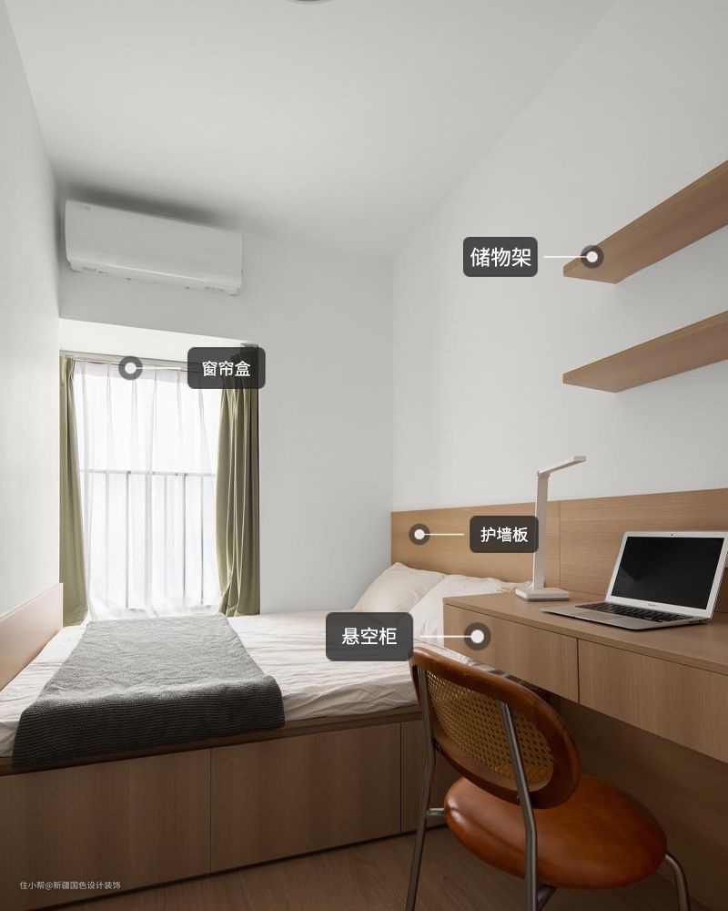 次卧面积相对比较小,床头部分与主卧一样做了护墙板和悬空柜,墙上固定木质储物架,让有限的空间发挥最大的作用。