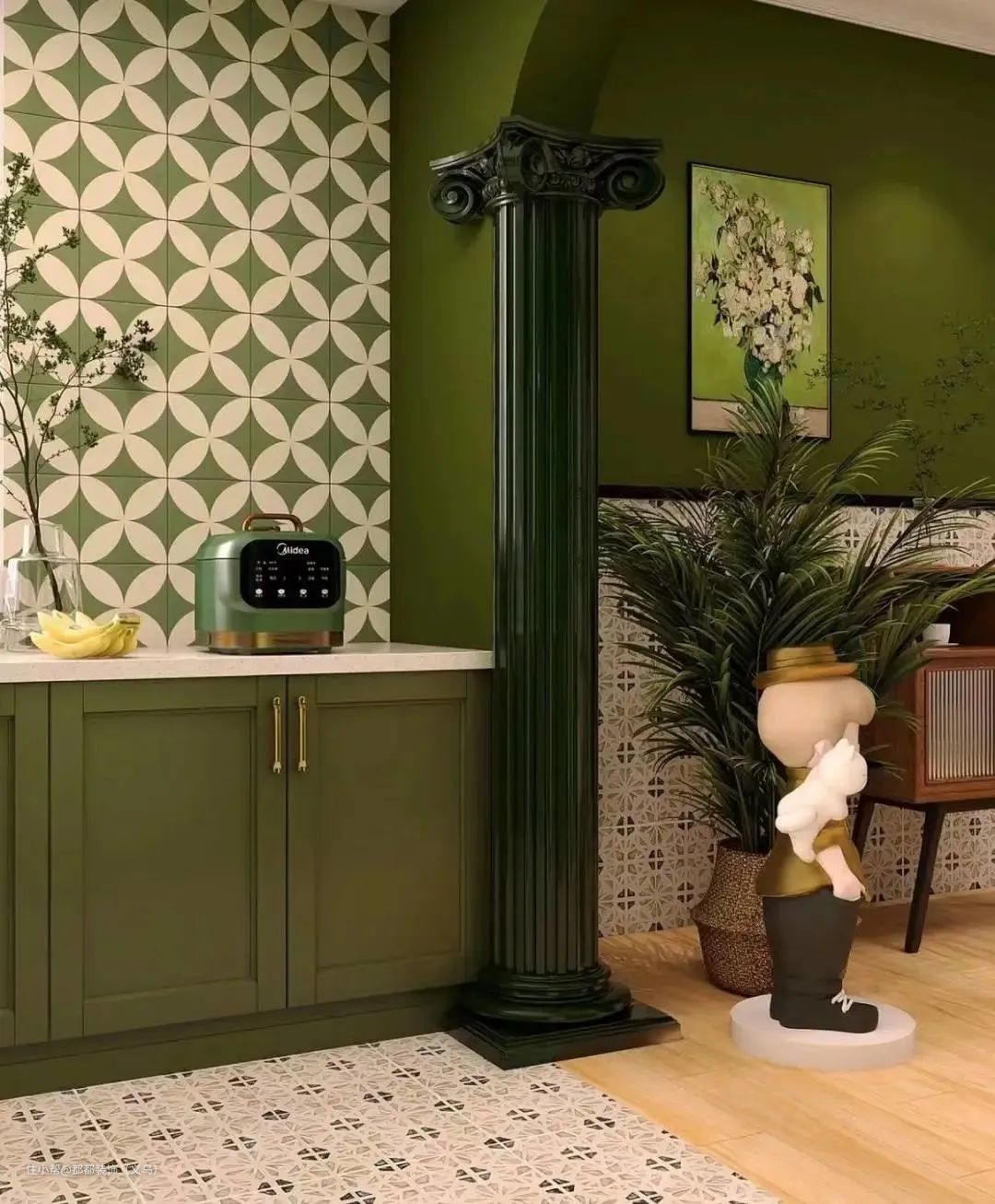 硬装上的元素要点有:曲线、花砖、百叶窗、老式木门、玻璃门洞等。