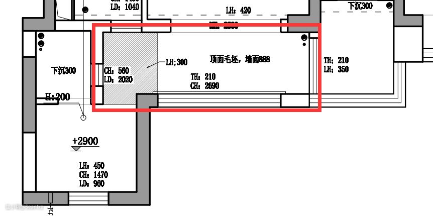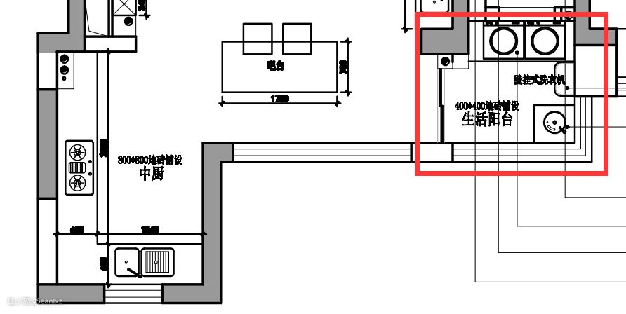 按常设计来看,这个红框里6㎡多的生活阳台是衣物晾晒的区域,一般都是洗衣机+晾衣架的设计,有个缺点,常年会有两排衣服挂在这里,又是落地窗和玻璃门,在客厅时时刻刻都能看到,来客人还要额外去收拾一下阳台上挂的衣物,占空间且麻烦,但没有干衣机的情况下只能这样设计,不然十分影响生活品质。
