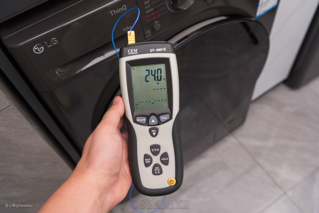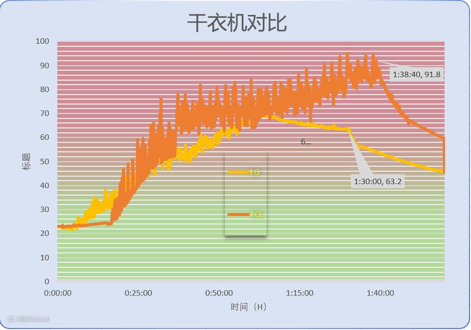 测试过其他款洗烘一体洗衣机的干衣功能,把两条曲线放一起对比来看LG效率更高,且温度更低,有效减小了衣物的损伤。