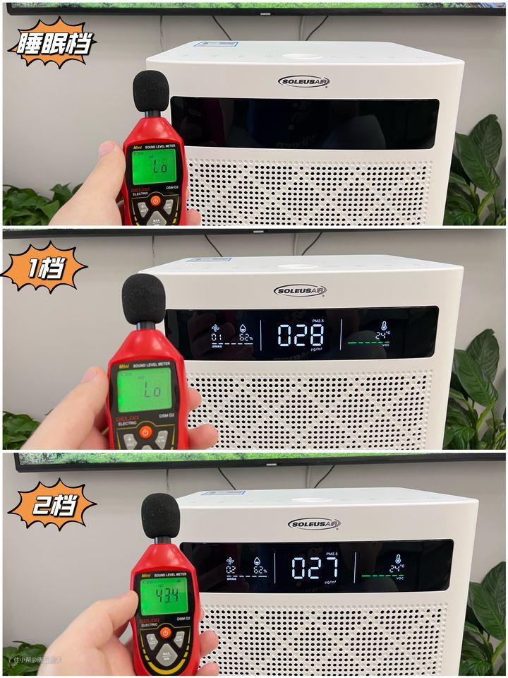 环境噪音在30db以下的情况下对这款空气消毒机的工作噪音进行测试,睡眠档至1档的测试结果分别是30db以下;30db以下;43.4db;