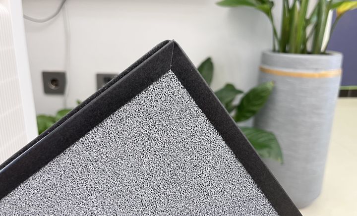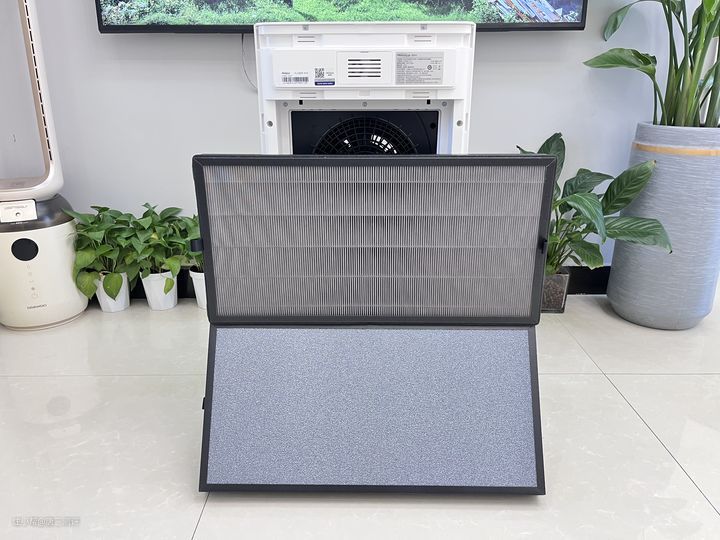 滤网一面能看到黑色细纱(初效滤网)和里面的载银HEPA滤网,另一面能像海绵一样的是光触媒网。