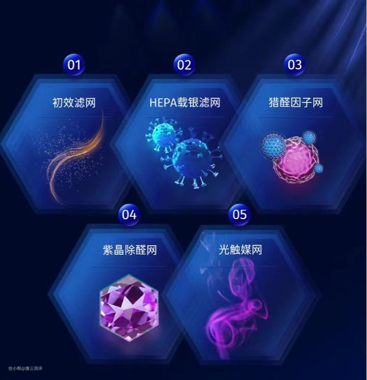 滤网共有五层,除了我们能看到的三层外还有里面的猎醛因子网+紫晶除醛网,这两层主要起到除醛作用。 初效滤网:过滤毛发、棉絮、纸屑等大颗粒污染物;