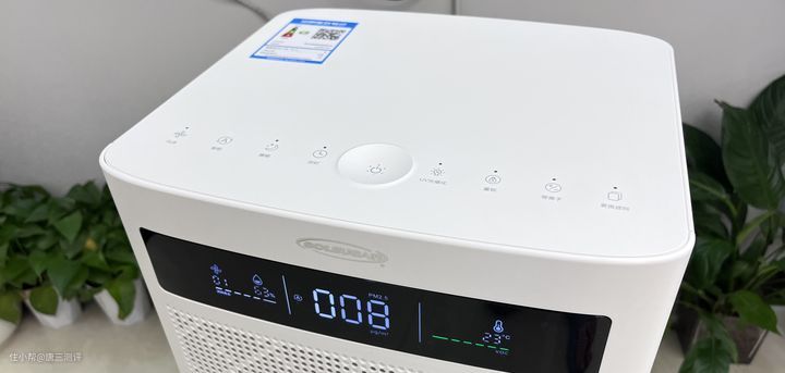顶部为主要操控区,C位是开关键,有点凹陷的感觉比较好确认。从左至右分别是风速调节、智能模式、睡眠模式、定时、UV光催化、童锁、等离子和更换滤网提醒。