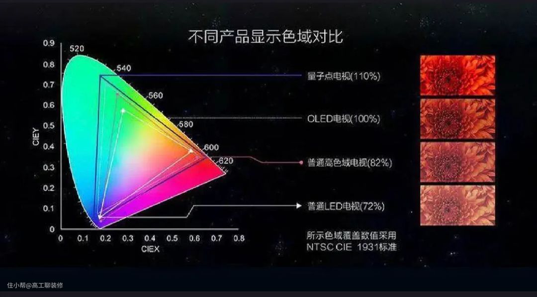 目前主流的液晶电视的色域范围一般都在NTSC值的72%左右,而广色域电视的色域范围一般来说要达到90%以上。